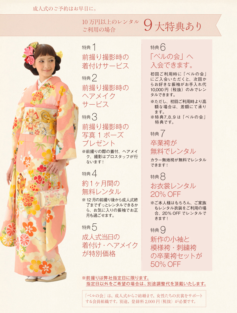 【セット内容】正絹振袖 / 帯 / 長襦袢 / 帯〆 / 帯揚げ /重ね衿 草履 / バック / 腰紐 / 伊達巻き / 衿芯 / 帯板 三重仮紐 / 帯まくら / コーリンベルト / 肌着 足袋 / タオル / 着物携帯バック ※肌着と足袋はプレゼント! 50,000円(税抜)セットをご利用いただいた方は、プラス30,000円と ベルの会入会登録料2,000円(初回のみ)で下の9大特典が受けられます。 ※30,000円(税抜)でのフルセットは1回限りのレンタル料金です。